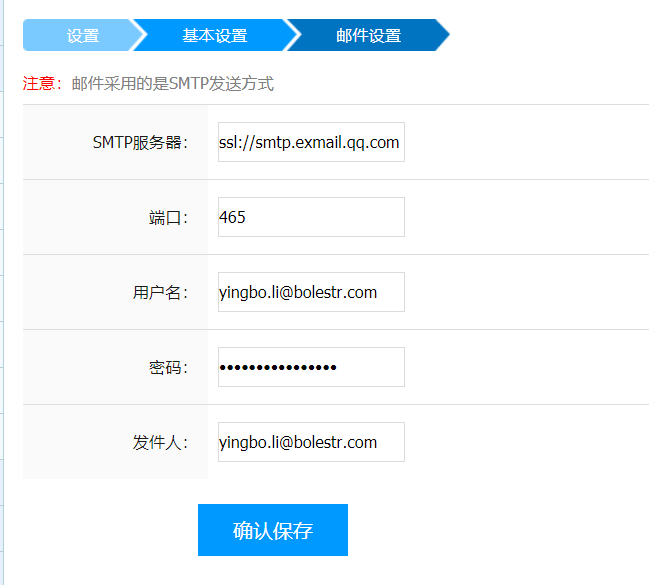 以下是腾讯企业邮件的自动发送设置。密码注意为系统生成的安全码,并不是邮件的密码